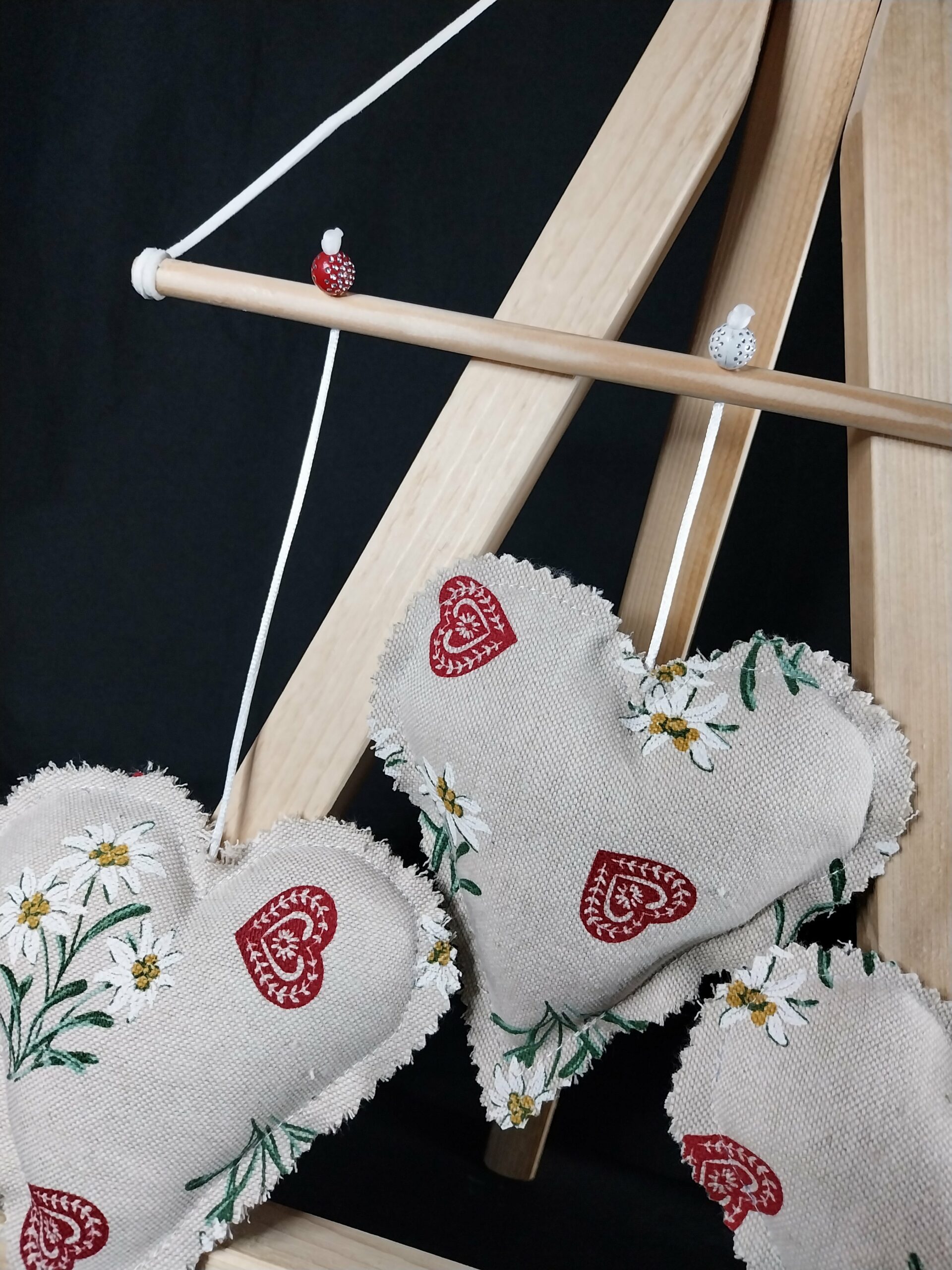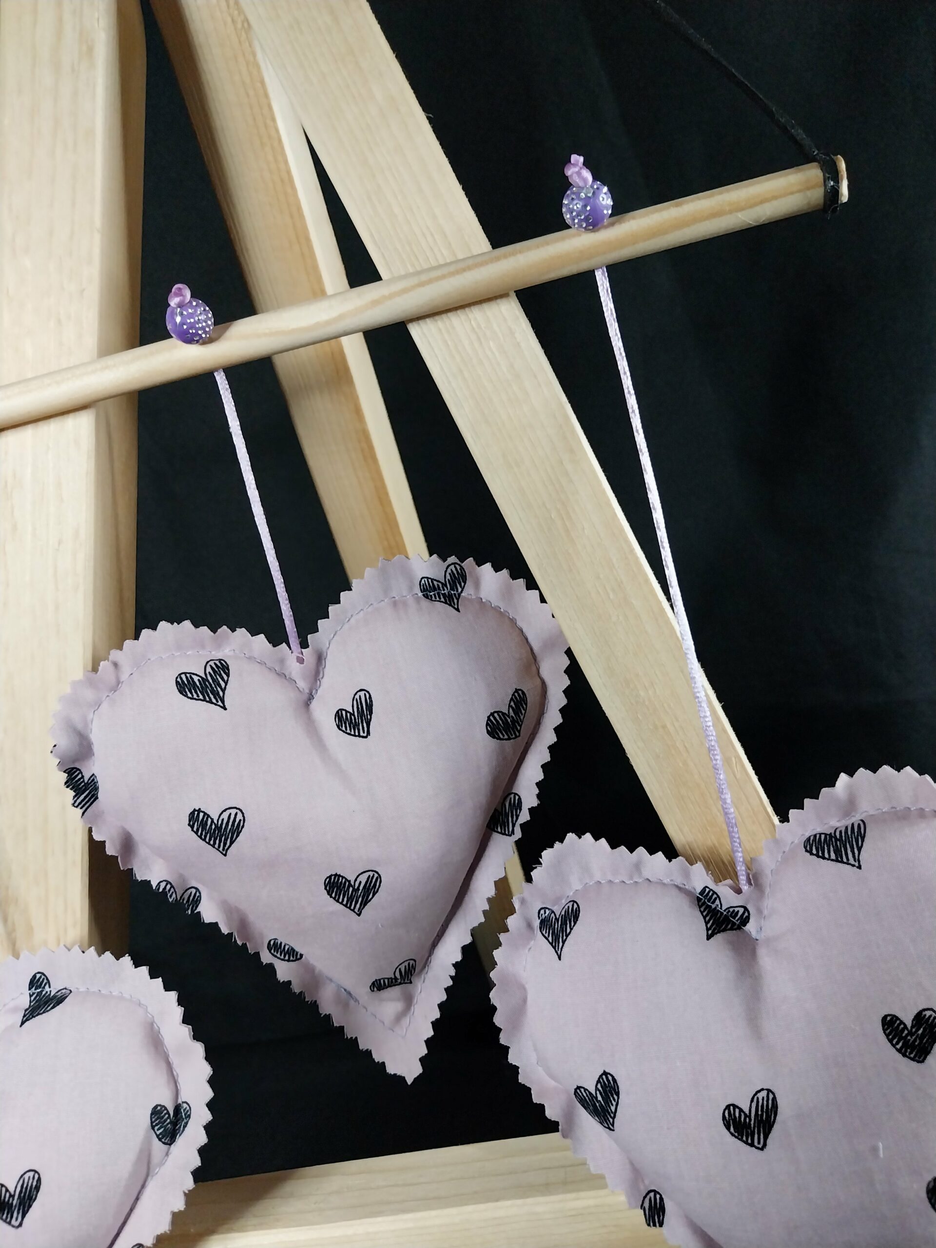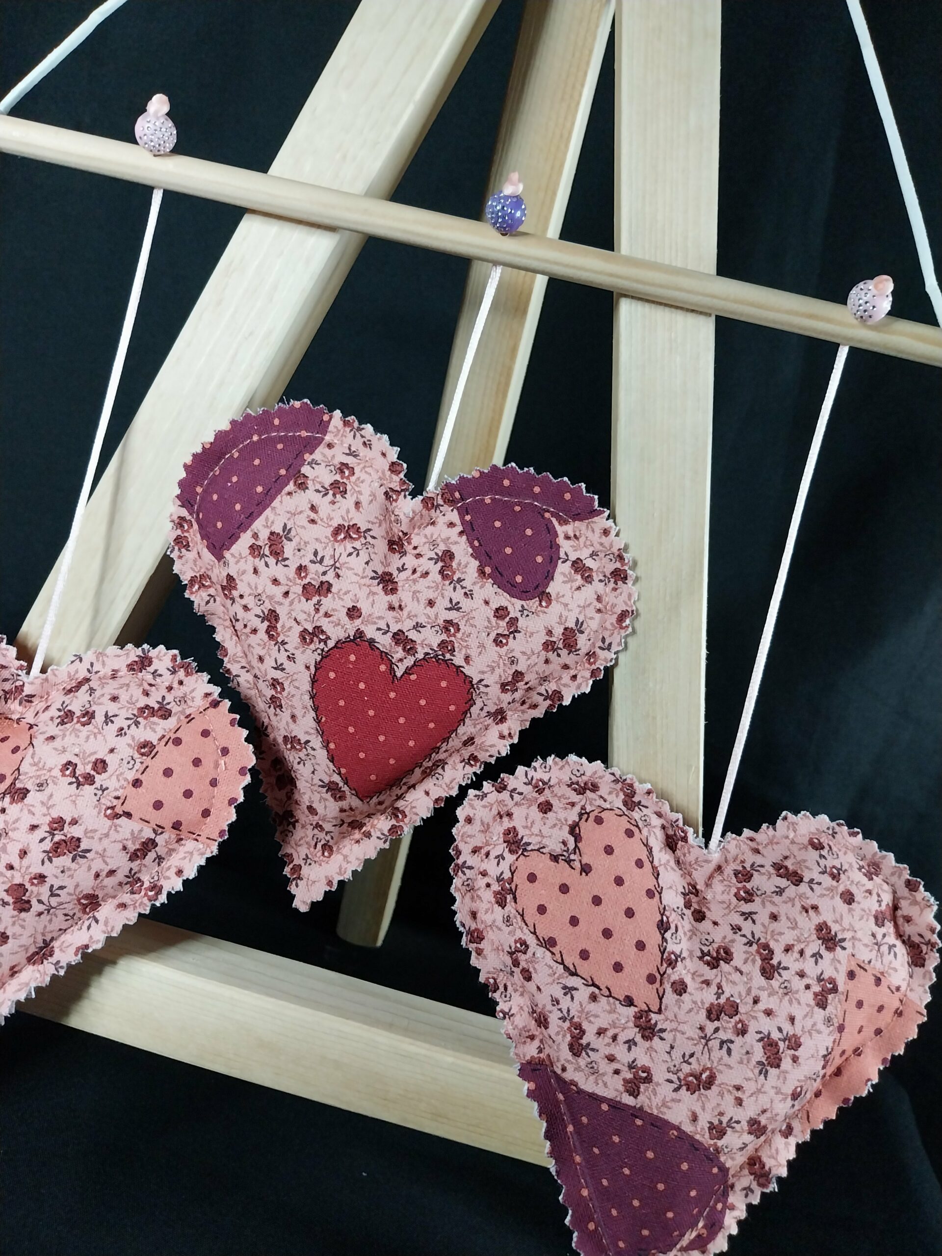 Attrape Cœurs est constitué de cœurs en coton, rembourré avec de la ouate et suspendus à une baguette de bois. Il est prêt à être installé, plus qu’à planter un petit clou ou un petit crochet au mur.