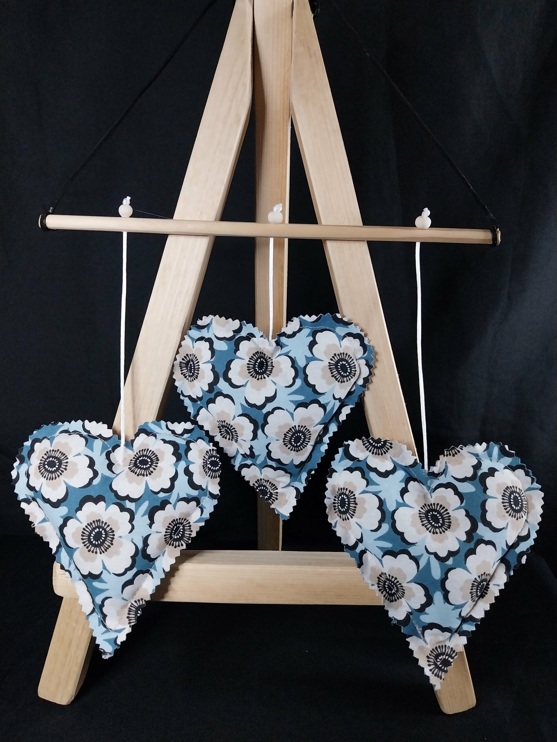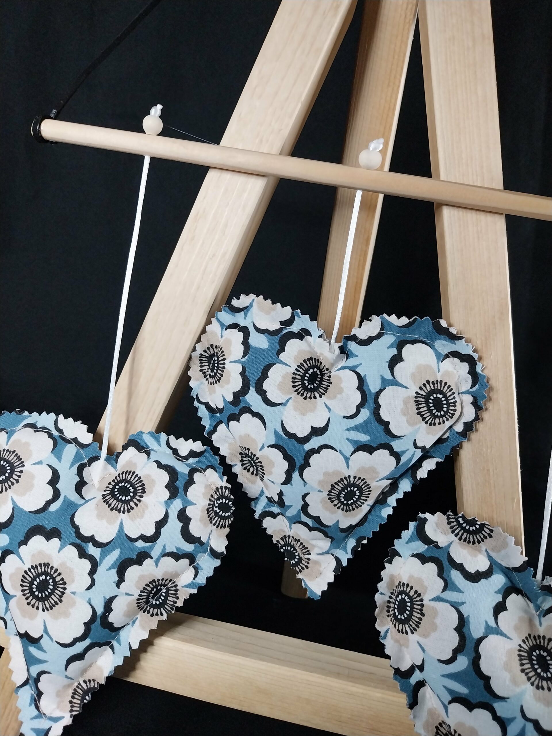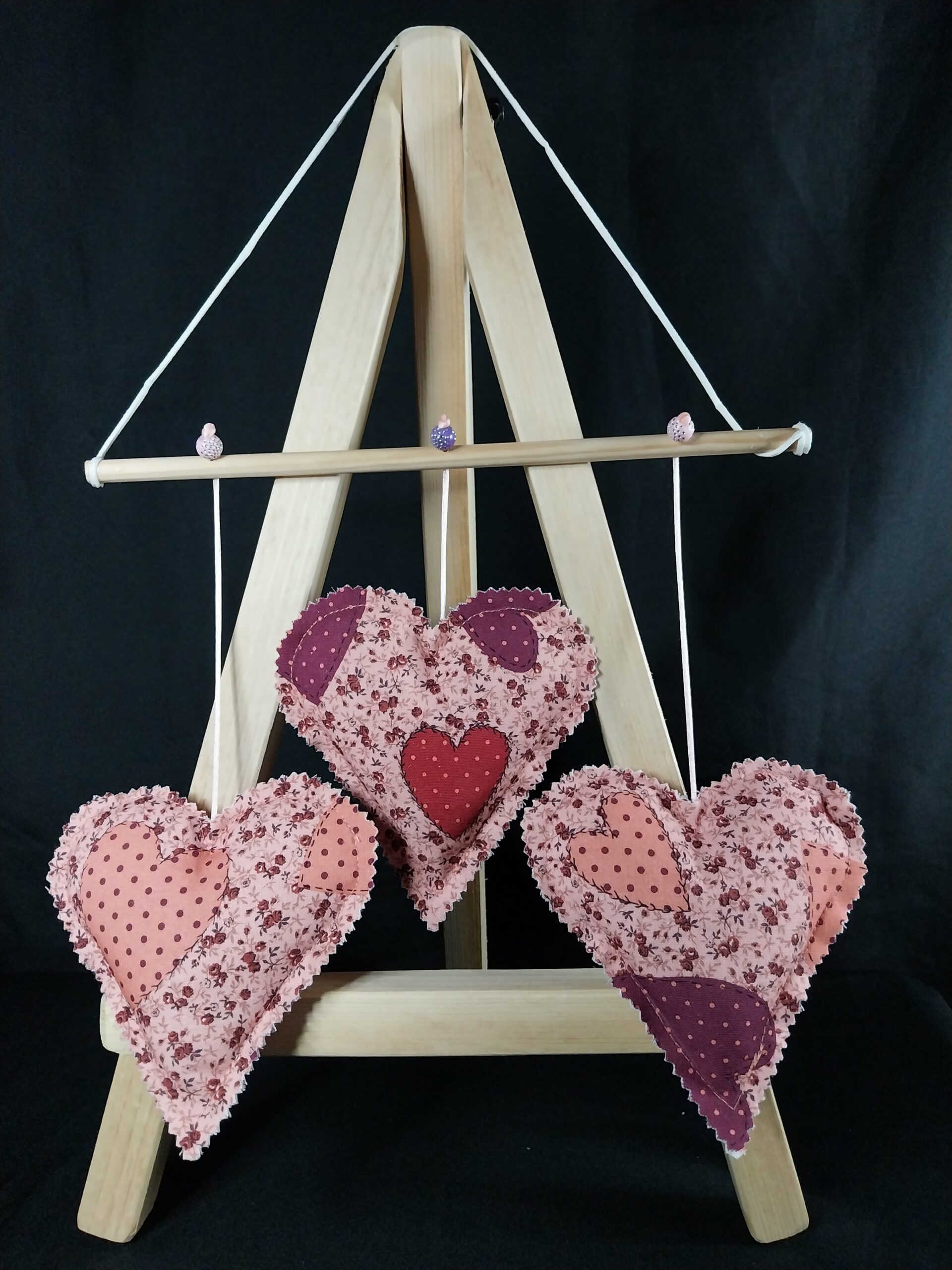 Attrape Cœurs est constitué de cœurs en coton, rembourré avec de la ouate et suspendus à une baguette de bois. Il est prêt à être installé, plus qu’à planter un petit clou ou un petit crochet au mur.