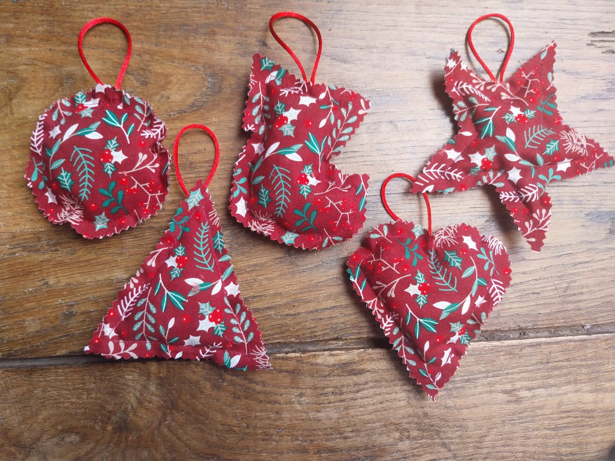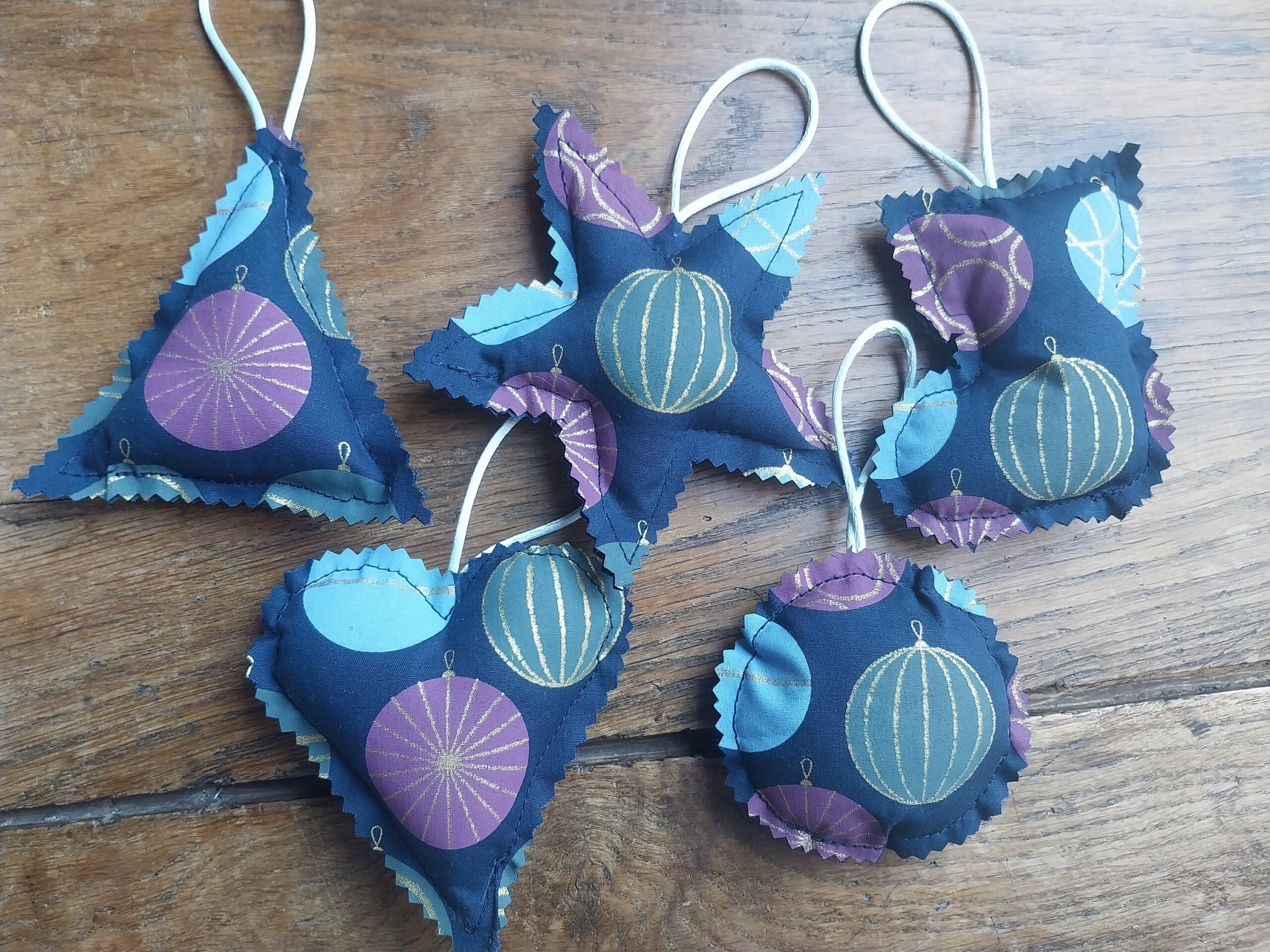 5 formes les composent, boule de Noël, cœur, botte de Noël, sapin, étoile. Equipés d’un ruban ou d’une cordelette, vous pouvez les accrocher partout où cela vous chante. Composés de cretonne de coton et rembourrés de fibres polyester.