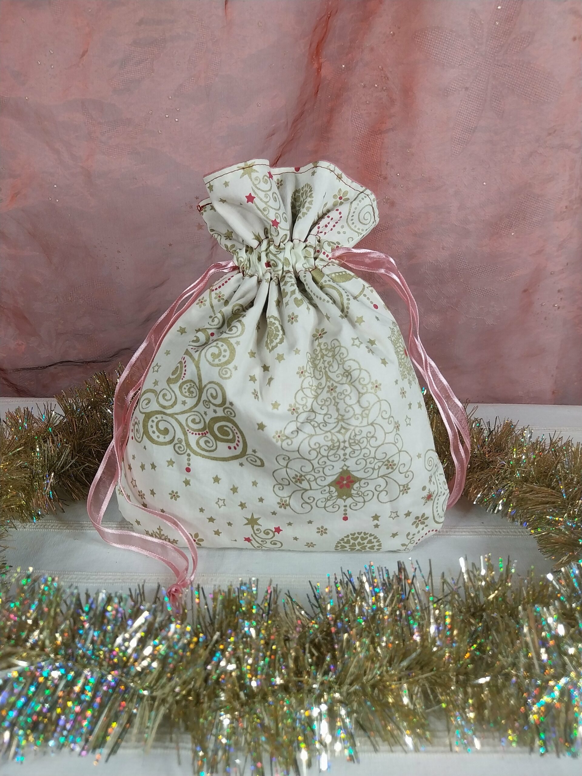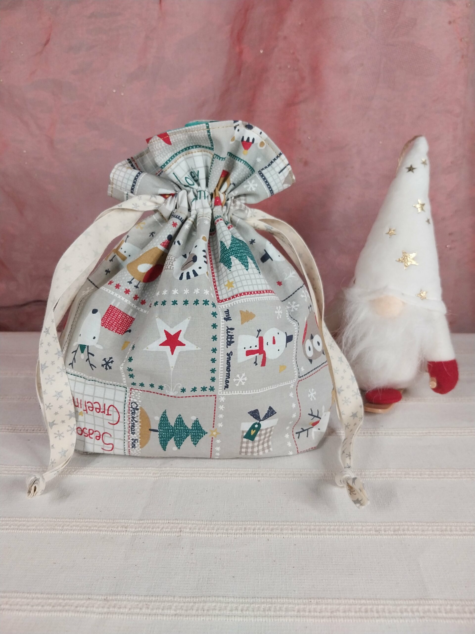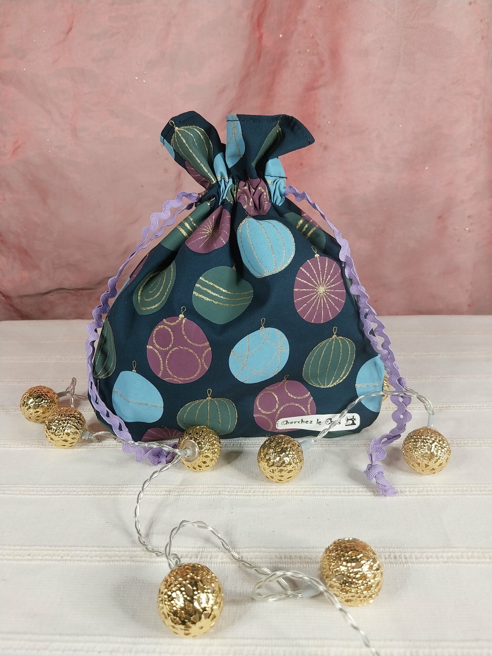 Un pochon qui peut servir de rangement et de papier cadeau. A vous de choisir. Vous pouvez emballer votre cadeau dans ce pochon et l’offrir, ensuite la personne le recevant pourra le réutiliser comme pochon de rangement. Les enfants peuvent y ranger de petits jouets, lego, perles, pièces de puzzle, etc… Les adultes peuvent y mettre des douceurs, du maquillage, des bijoux, etc…