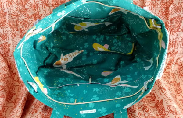 Extérieur en bachette de coton à motifs carpes koï sur fond vert, pour une meilleure tenue il est renforcé par du thermocollant. Intérieur identique mais non thermocollé. Un joli passepoil doré entre le bas du revers intérieur et la doublure. Une poche simple et une poche à double compartiment doublée rose à l’intérieur. Les poches ferment grâce à des pressions en résine en forme d’étoiles. Une accroche clés sur une poche. Anses en bachette de coton identique au sac.