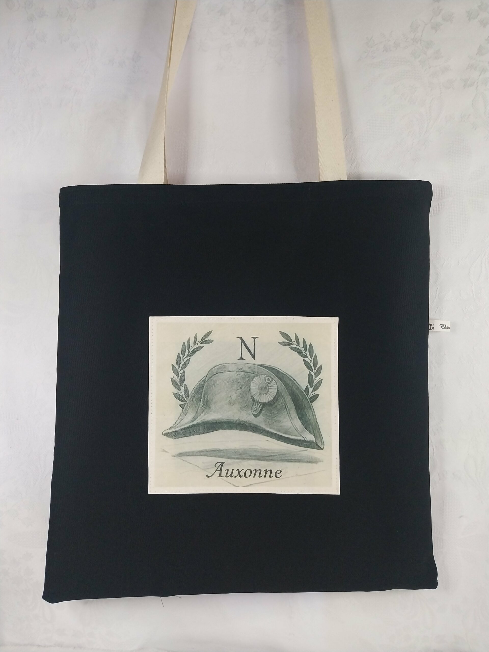Je confectionne ces tote bag sont en toile de coton de coloris varié. Ils ne possèdent, d’ailleurs, aucune doublure. Toutefois, une couture anglaise vient renforcer l’ensemble, ce qui permet, en conséquence, de dissimuler les coutures. Le motif est, en effet, un dessin manuel, reproduit sur du papier transfert et, ainsi, appliqué sur une morceau de coton écru. Cette technique met en valeur le motif. Les anses sont en sergé de coton écrues. Tout est vraiment artisanal.