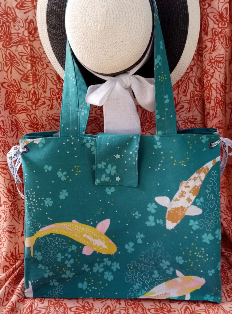 Extérieur et intérieur en bâchette de coton à motifs carpes koï. Capacité modulable par des œillets et un ruban latéralement. Fermeture par une languette pressionnée à 2 niveaux. 3 poches intérieures pressionnées également.